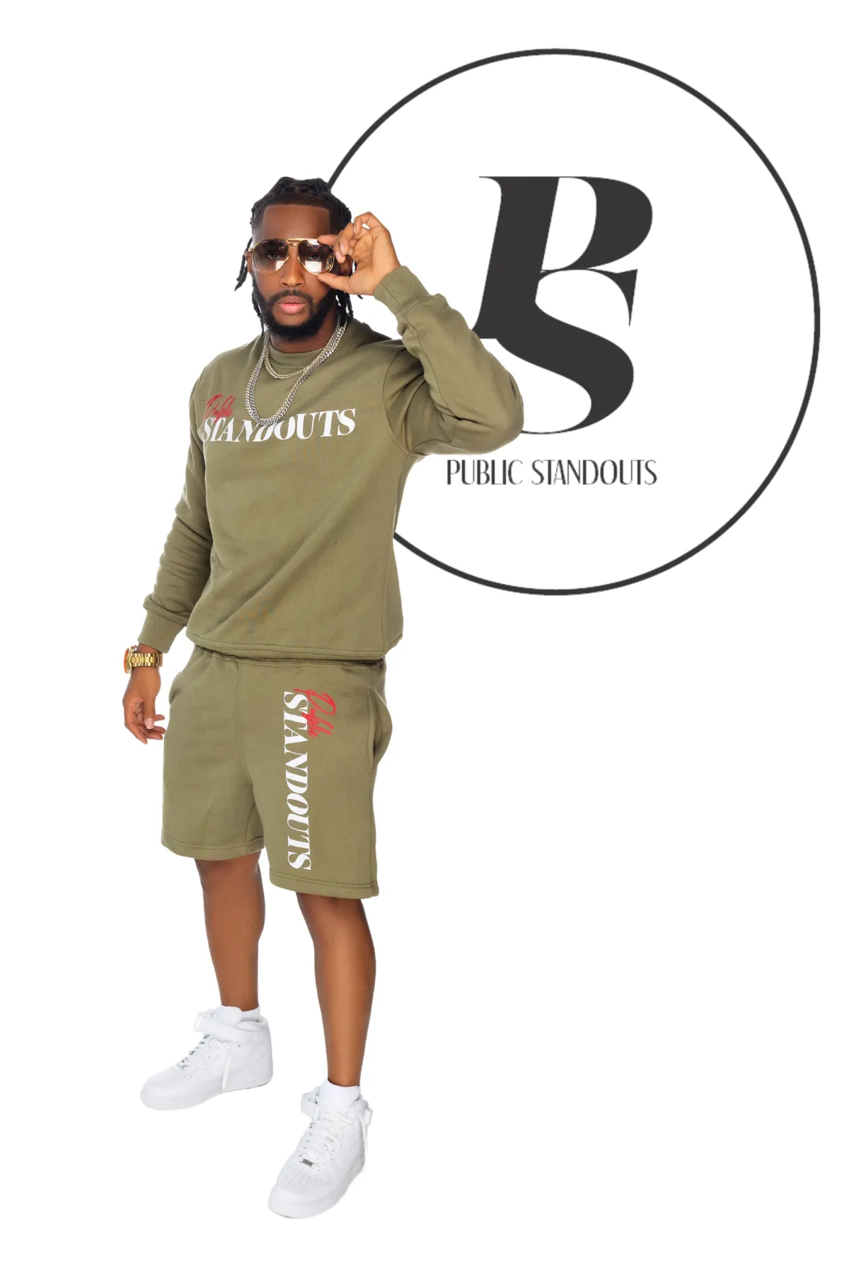 Olive Green & Charcoal Gray Crew Neck + Shorts Set.